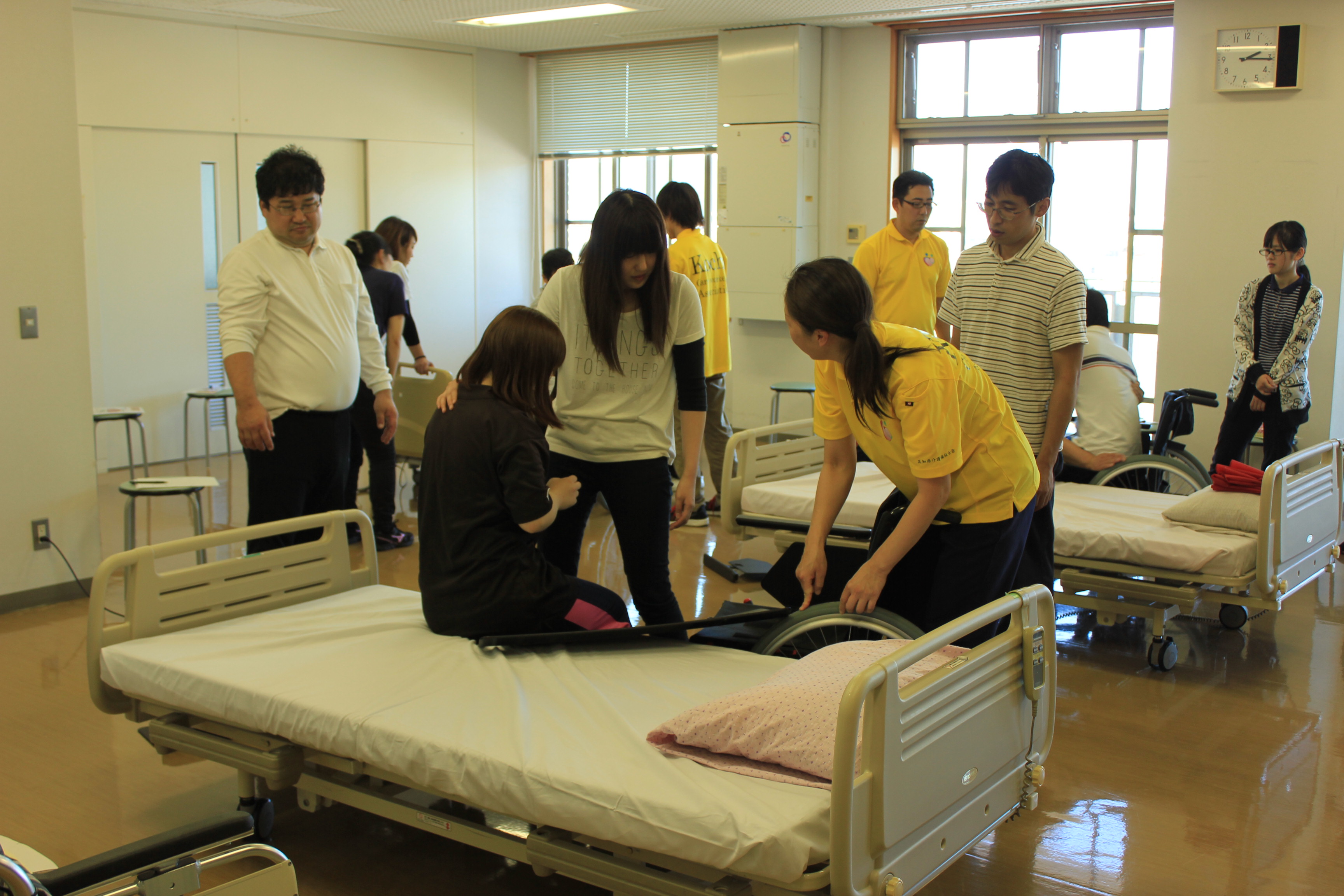 移乗介助、スライドシート、スライドボードの使い方、更衣の基本的な仕方に関して技術講習を行いました。