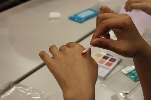 ベースのファンデーションは手の甲で色を作っていきます